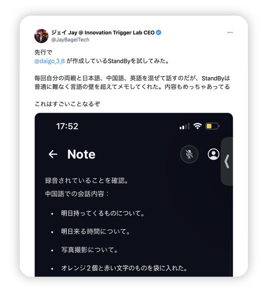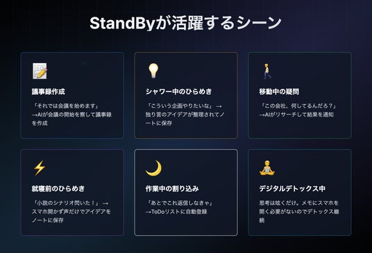 StandByは24時間音声を解析し、ユーザーのライフログや文字起こしを蓄積することで、