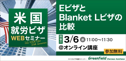米国ビザ申請代行業務をおこなう株式会社グリーンフィールド・オーバーシーズ・アシスタンス(本社:東京都千代田区 代表取締役社長:渡邊 究)は、2024年3月6日(水)に米国ビザ取得をご検討中の企業様に向けにビザ担当者が押さえておくべき、EビザとBlanket Lビザの違いや条件をテーマにしたWEBセミナーを開催します。