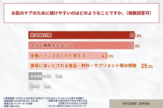 そこでハイケア高濃度水素によるスキンケア事業を展開するハイケアジャパン(株式会社ビースタイル)は40代以上の女性が「お肌のケアのためにしていること」に関する調査を行いました。