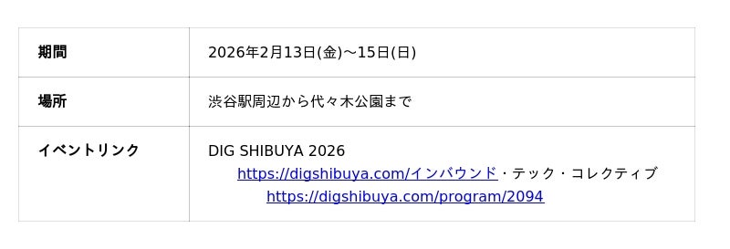 シブヤスタートアップス株式会社(本社:東京都渋谷区、代表取締役社長:田坂 克郎、以下、シブヤスタートアップス)と株式会社Pie Systems Japan(本社:東京都中央区、CEO:水野 博商、以下Pie Systems)は、テクノロジーと文化の実験場としてのフェスティバル「DIG SHIBUYA 2026」(2026年2月13日~15日)において、インバウンドに関連するテクノロジーを活用した地域産業およびイベントの振興に向けた実証「インバウンド・テック・コレクティブ」を開始します。