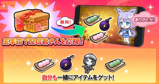 ・視聴時に配信者へ「玉手箱」を贈ると、配信者と視聴者の双方がアイテムをGETでき、バトルで使用して有利にプレイできます!