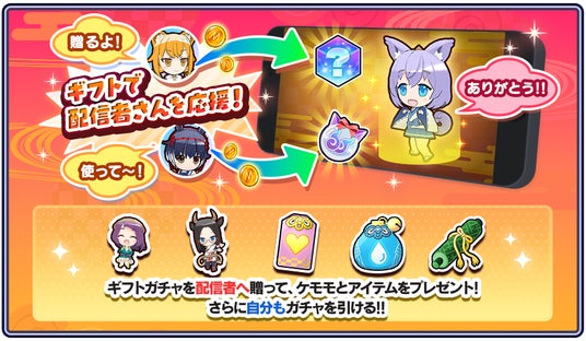 ・視聴者から「ギフトガチャ」が贈られると、配信者と視聴者の双方がケモモやアイテムをGETでき、ケモモを育成できます!