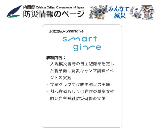 防災の中心的役割を担う内閣府とのコラボレーションに賛同し採択された「賛同企業等」を掲載している内閣府の特設サイトに、一般社団法人Smartgiveが登録・掲載されました。