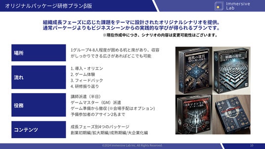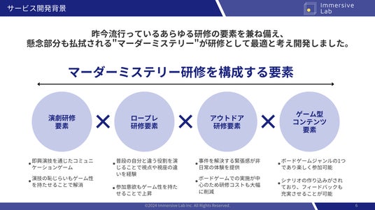 株式会社イマーシブ・ラボ(本社:東京都渋谷区、代表取締役社長:小池弾、細川哲星、水谷優斗)は、企業内での心理的安全性の向上やチームビルディングの課題解決を目的とした「マーダーミステリー研修サービス」を新たに提供開始しました。本サービスは、離職率低下や組織の活性化を目指す経営者や人事部門の担当者、またマネージャー層を主な対象とし、従来の研修とは異なる「体験型」の手法を採用しています。