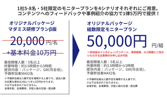 本サービスの提供開始に伴い、期間限定でテストモニターを募集いたします。モニター企業には特別料金でのご提供とともに、実施後のフィードバックやマーケティングへの協力をお願いしております。