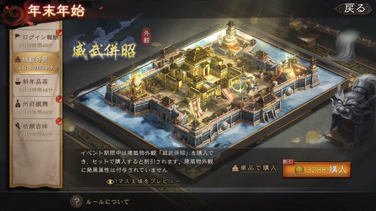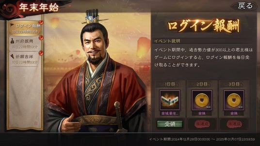 新年を迎える特別な期間中、過去勢力値が300以上の君主は、ゲームにログインすることで日替わりのログイン報酬を受け取ることができます。この期間中の連続ログインは、効率的な資源の確保や強化の好機、日々のログインを欠かさず行い、イベント特典を最大限に活用してください!