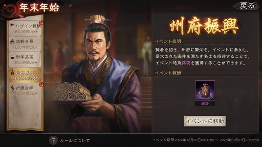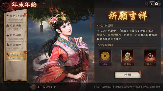 一年間大変お世話になりました!新年を祝う特別なイベントが盛りだくさん!君主の皆様に感謝の気持ちを込めて、豪華な報酬を準備いたしました。ここでは、各イベントの詳細をご紹介いたします。