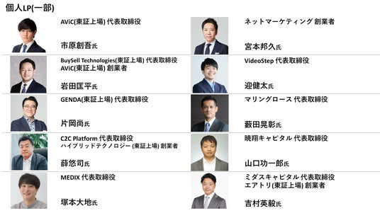 Dual Bridge Capitalが運営する1号ファンドにおいては、下図の通り我が国を代表する金融機関やスタートアップフレンドリーな事業会社、及びグロース企業のIPOやM&A、上場/未上場株投資といった各領域で傑出した実績をお持ちの経営者の皆様からご出資を賜りました。