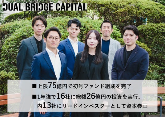 ベンチャーキャピタルファンドを運営する株式会社Dual Bridge Capital(代表者:伊東駿、寺田修輔、株主: 伊東駿、寺田修輔、株式会社ミダスキャピタル)は、1号ファンドに新たなLPとして三井住友信託銀行株式会社、株式会社九州リースサービス、株式会社中国新聞社、日本郵政キャピタル株式会社、株式会社山陰合同銀行、CPAエクセレントパートナーズ株式会社、静岡ガス株式会社、及び複数の個人投資家をお迎えし、上限としていた総額75億円で出資の募集を完了したことをお知らせ致します。