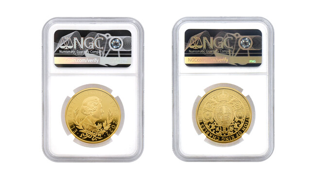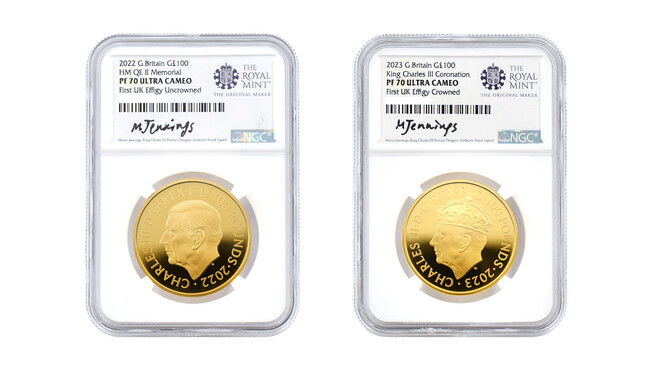 今回のセット商品は全てのコインに70鑑定が付与されており、スラブケースの特別ラベルにはチャールズ3世の肖像をデザインしたマーティン・ジェニングス氏の直筆サインがあしらわれています。