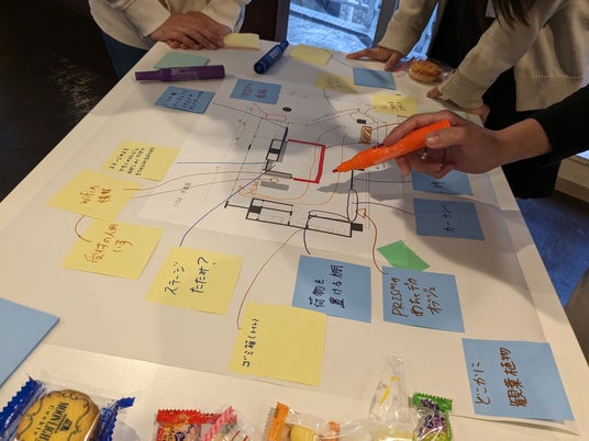 ちばユースセンター「PRISM」の内装ワークショップ。図面を見て、どこに何が欲しいのか、意見を出し合いました。