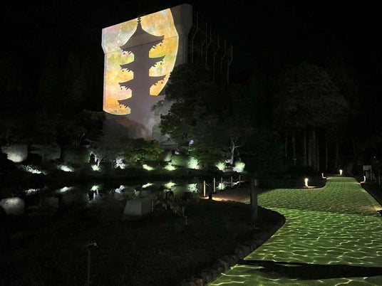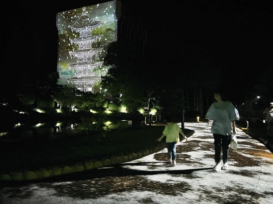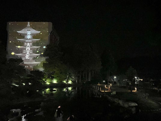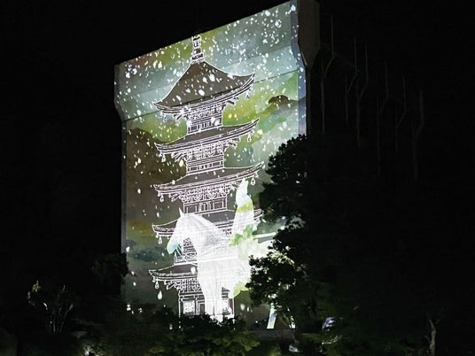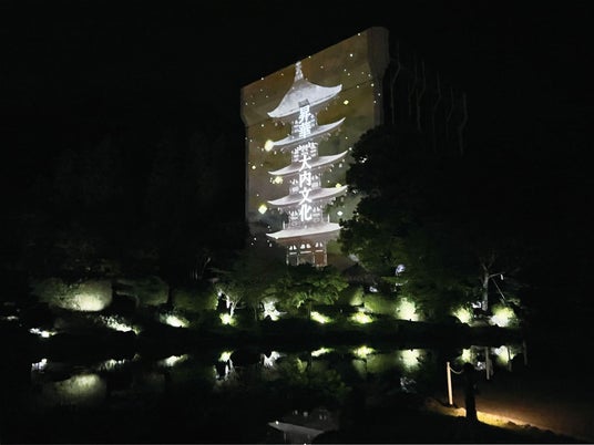 国宝瑠璃光寺五重塔を覆うデザインシートを舞台としたプロジェクションマッピング
