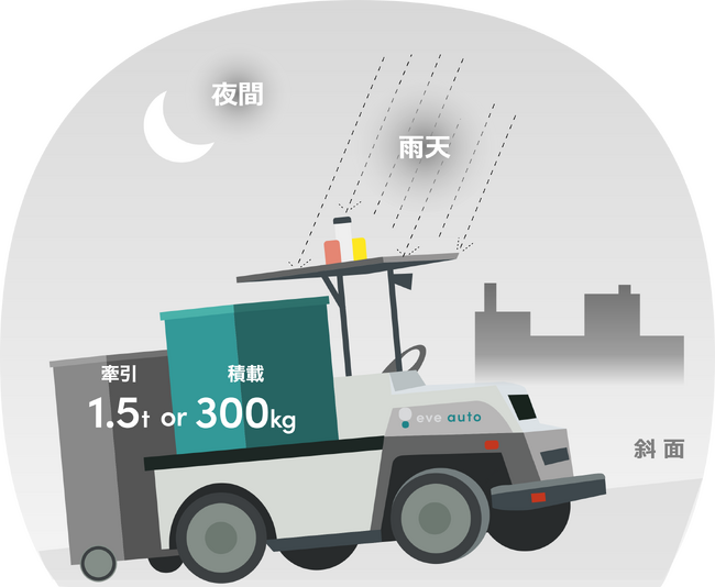 eve autonomyは物流施設向けに、主に屋外における事前の設備工事を必要とせずに自動搬送システムの導入を実現するソリューション「eve auto(R)」を提供しております。段差や坂道などの路面環境および天候条件など、屋外ではより厳しい環境での運用が求められますが、eve auto(R)は高い信頼性を誇るEVカートと最先端の自動運転技術を活用し、雨天や夜間でも物流施設等の敷地内屋外環境で自動運転レベル4の無人搬送運用を実現しているため、24時間稼働が求められる施設での運用も可能です。