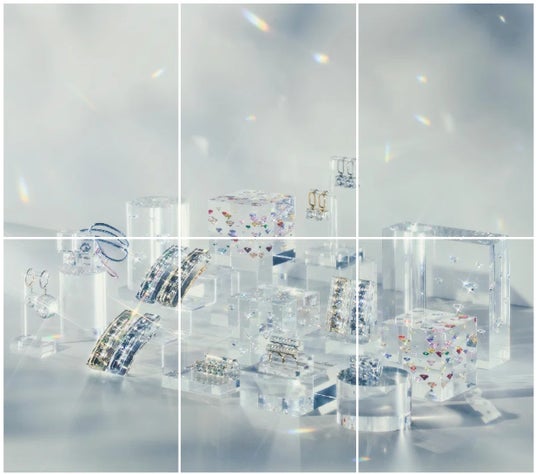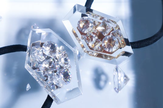 ラウンドカット、スクエアカット、バケットカットの大きさや形が異なるストーンを、視覚的な楽しさと不思議さ、透明感と光の反射が美しく引き立つように配置しました。