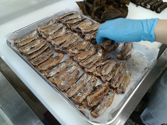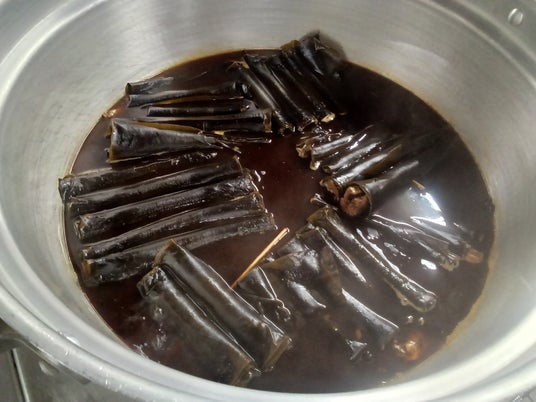 ※よく冷まし昆布に巻いてから秋刀魚の戻し汁で焚き、黒糖、醤油などで味付け。