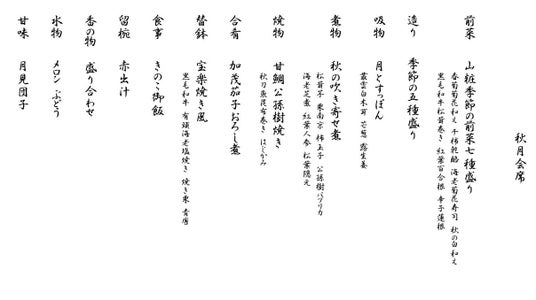今年度の秋月会席は、皆様に美味しく満足いただけるよう試行錯誤致しました。秋は様々な食材が豊富にありますが、この数年食材の育ちが良くなく品切れで入荷できなかったり、値段が高騰して いる食材もありますので、一品一品が完成するまで様々な 食材でチャレンジしました。細かい料理にも秋を堪能していただければと思います。