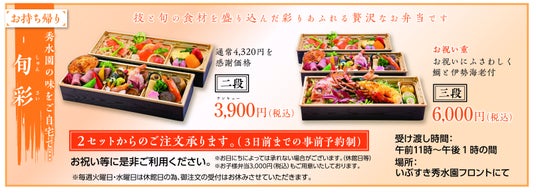 宿泊プランだけでなく、食事のみ(ご夕食)のご提供や豪華旬彩弁当(2段、3段)もご準備しております。 詳しい情報は直接いぶすき秀水園予約課(0993-23-4141)までお問い合わせ下さいませ。