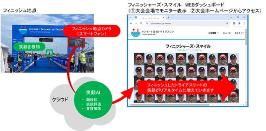 また,フィニッシュ地点のカメラ映像に現れるトライアスリートたちの顔をAIが抽出、笑顔を分析して、WEBダッシュボード上にフィニッシュした喜びの笑顔をリアルタイムに並べていく,「フィニッシャーズ・スマイル」と名付けた実験も実施します。(図2)