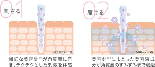 純度99%の繊細な美容針※3を1商品(30mL)あたり約15万本配合(1mlあたり約5,000本配合)。美容針※3が美容液成分を纏った状態で角質層まで届き、肌本来の美しさを目覚めさせます。