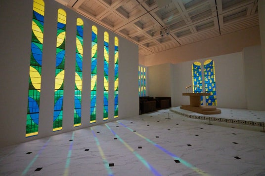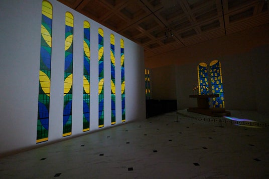 今回、ヴァンスのドミニコ修道会とマティス家の許可を得て、礼拝堂の内部を原寸大で再現しました。ステンドグラスを通じて差し込む鮮やかな光も表現し、1日の光の移り変わりを約3分で体験することができます。