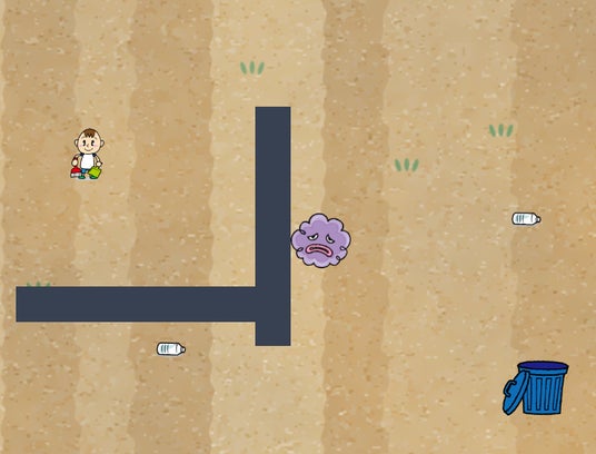 付録のQRコードを読み込むと、絵本の世界を再現したゲームで遊ぶことができます。「ぼく」を操作して、追いかけてくる「ホコリンリン星人」から逃げながらゴミを集めてゴミ箱へ運べばクリアです。ぜひ挑戦して、クリアを目指してください。
