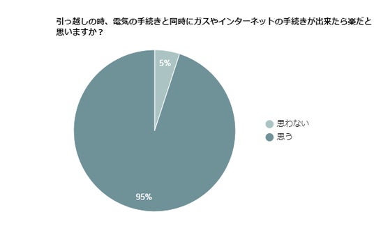 引っ越しの時、電気の手続きと一緒にガスやインターネットの手続きも一緒にできたら楽だと思っているのは95%と、今回調査したほとんどの方が感じていることがわかりました。