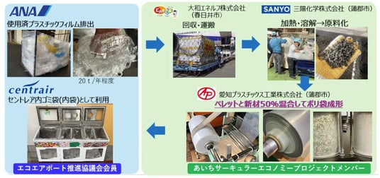 全日本空輸(ANA)から排出されるストレッチフィルムを、リサイクラーにてセントレアで使用するごみ袋として資源循環するものです。このスキームで大和エネルフ(株)は、回収・運搬を担っています。