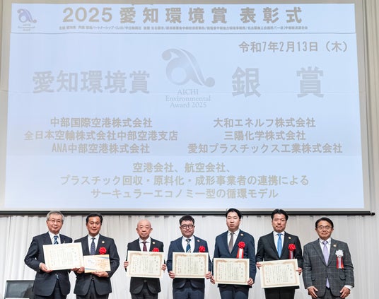 2025年2月13日に開催された「2025愛知環境賞」に愛知県・中部国際空港(セントレア)・全日本空輸(ANA)等と協同した「プラスチックフィルムの資源循環型スキーム」により銀賞を受賞しました。