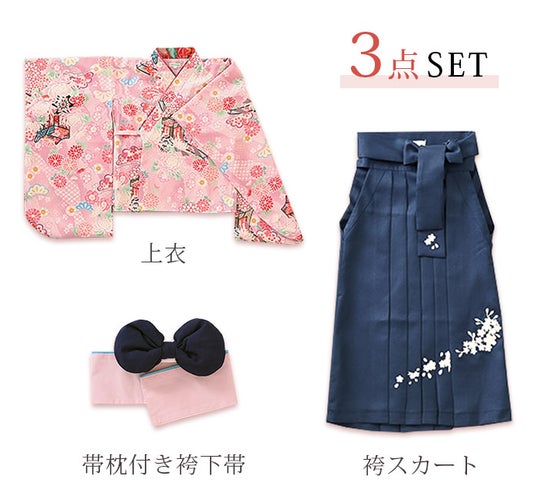 - 上衣、袴スカート、帯枕付き袴下帯の3点セット