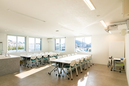 陽光豊かなセミナー室。席数36、遮光しての大画面プロジェクター使用も可能