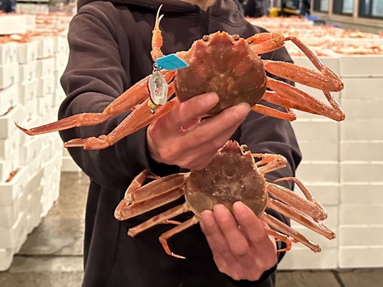 加能ガニには2021年より最高級ブランド「輝(かがやき)」、香箱ガニには2022年より「輝姫(かがやきひめ)」というブランドが設定され、特定の基準を満たしたものだけに九谷焼デザインを施したタグがつけられます。2024年の初競りでは、金沢港で水揚げされた香箱ガニ2匹が厳しい基準をクリアし、「輝姫」に認定され、それぞれ4万円の値が付きました。