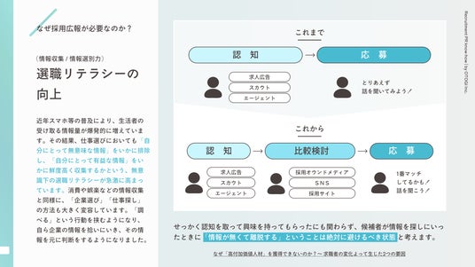 採用市場が激化する中、多くの企業が「応募が集まらない」「途中離脱が多い」「求人だけでは魅力が伝わらない」といった課題を抱えています。その背景には、求職者の“選職リテラシー”の向上があります。