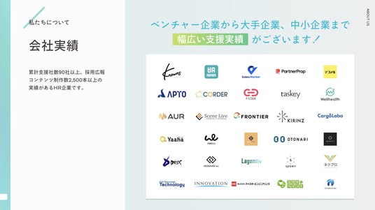 「採用狭報を採用のスタンダードに」というミッションを掲げ、採用広報の力で、企業の魅力を最大限に引き出し、最適な人材とのマッチングを実現するため、「Wantedly運用支援サービス」「採用広報 / 狭報支援サービス」を展開しております。累計支援社数90社以上、採用広報コンテンツ制作数2,500本以上の実績があるHR会社です。