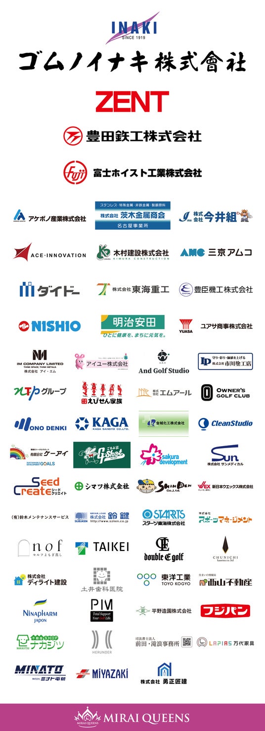 そうした想いのもと、中部女子プロゴルフ会とのタイアップにより、愛知県・中部地区を拠点とする女子プロゴルファーを 中心に、世代・地域・レベルを超えた実戦の場として、第1回愛知レディースオープンゴルフトーナメント「MIRAIQUEENS」を 企画させていただきました。
