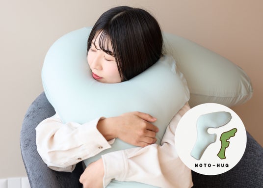 「のとハグ」は、能登半島の地形をモチーフにした独自のフォルムが特長の、多用途に使える癒しの抱き枕です。横向き寝時には骨盤をやさしく支え、椅子では膝置きや腰あてとしてフィットし、ごろ寝やうつ伏せ読書の際にはふんわりと身体を包み込むなど、シーンに応じて柔軟に形を変えながら快適な姿勢をサポートします。感情への寄り添いと身体へのやさしさを両立した設計で、日常のさまざまな時間に“ほっとする居場所”をつくり出します。