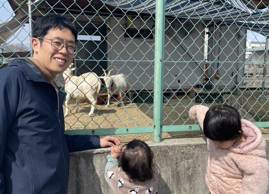 本庄市「こだま館」のヤギを親子で見学する代表八木