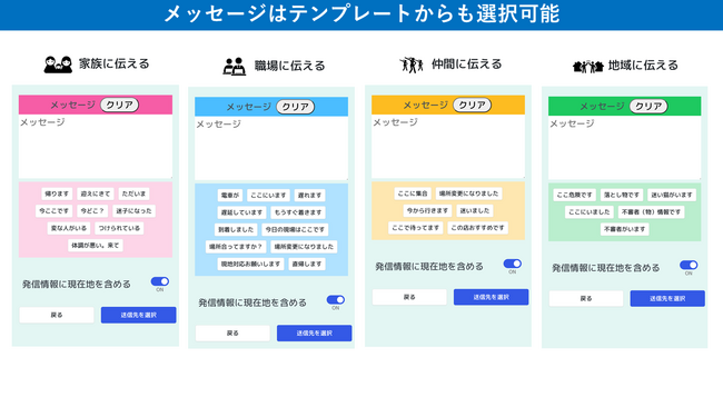 メッセージや現在地情報とともにお知らせ・共有ができる。