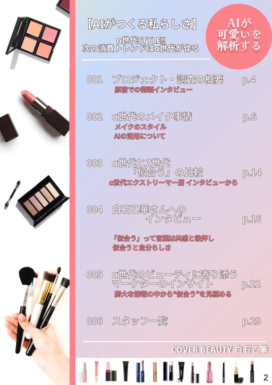 本レポートでは、特に株式会社コーセー様のご協力のもと、『α世代「メイク」の意識と行動』を深掘り調査しました。女優・モデルの白石乙華さんへのインタビューや原宿での街頭インタビューを含む定量・定性調査を実施。「Z世代とα世代の価値観の変化」を産業能率大学ゼミ生(Z世代)とα世代ラボメンバーが共同で調査・分析いたしました。