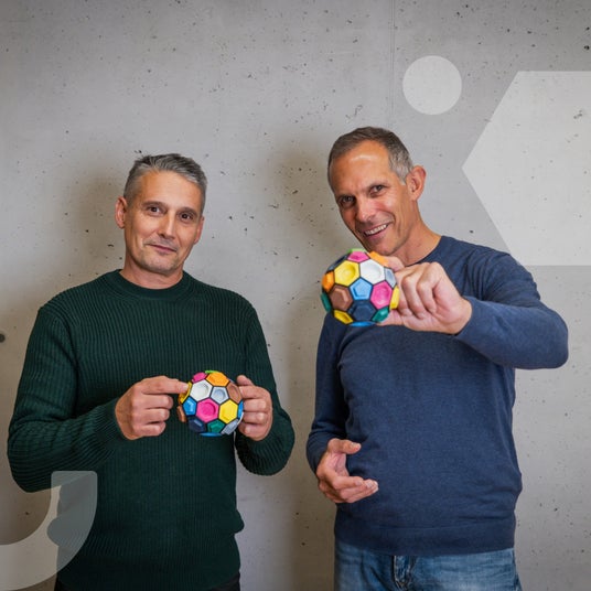 【Boulderball】の考案者、(左)認知科学の専門家のヨアヒム氏(右)スポーツ科学の専門家であり熱心なクライマーのディーター氏(CEO)2人はおさななじみ。