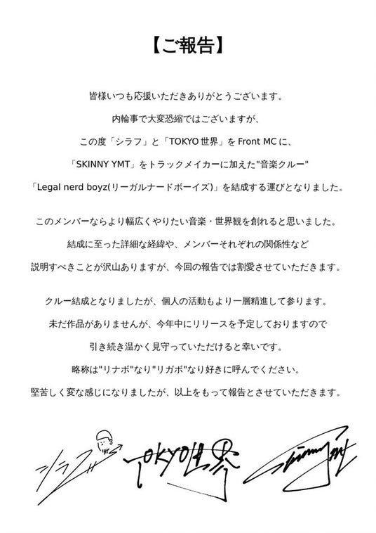 本日、8月1日(木)に「Leagl nerd boys」のクルー結成を発表。