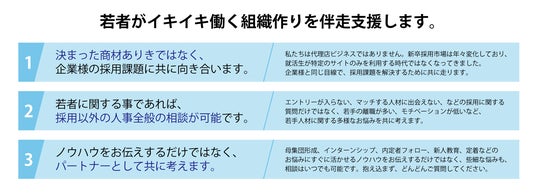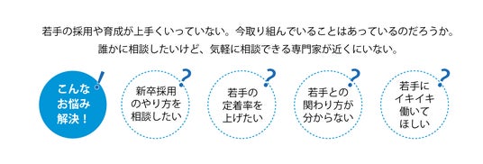 一方、改善に向けて取り組まれている企業様から頂くお声として、「とりあえず昨年の採用を踏襲しているがこのままでいいのか?」「最近若手の雰囲気が良くないので何とかしたい」という中長期的な改善が必要な課題から、「急な応募があったから相談したい」「ナビサイトの文章を変えたいが何かいい表現はない?」など急ぎの対応策まで、人事に関する課題は多様であり、対応スパンも様々です。これらのお声を受け、決まったパッケージではなく、私たち専門家が常にパートナーとして共に伴走するサービスを開始いたします。