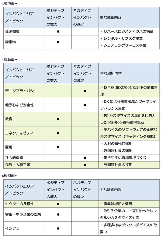 弊社のサステナビリティ活動等を分析した結果、ポジティブ・インパクトとして「教育」、「コネクティビティ」、「雇用」、「セクターの多様性」、「零細・中小企業の繁栄」、「インフラ」、「資源強度」、「廃棄物」が抽出され、ネガティブ・インパクトとして、「データプライバシー」、「健康および安全性」、「社会的保護」、「民族・人種平等」が抽出されました。