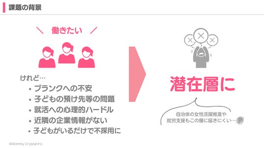 子育て中の女性たちが、なかなか一歩踏み出せない背景には複雑な課題が山積みです。