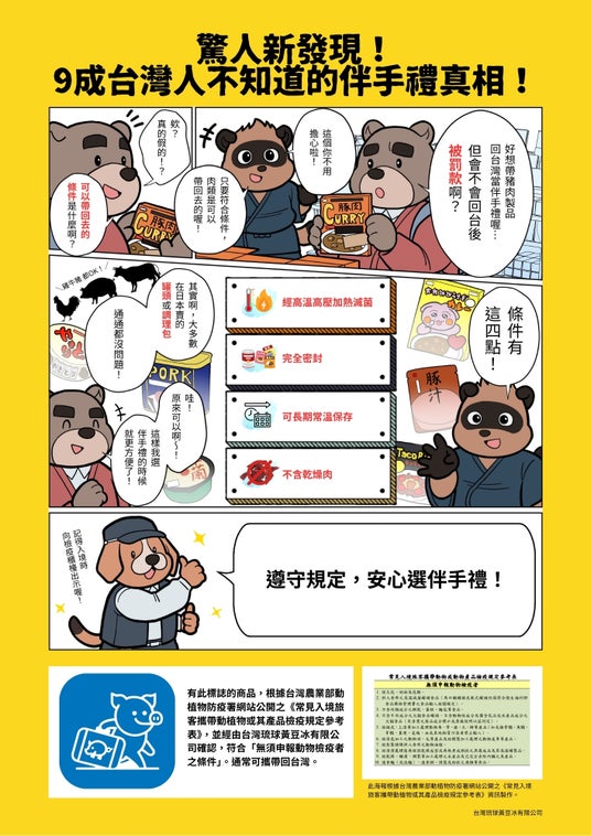 2025年春節の台湾人観光客増加に向け、肉製品持ち込み規制の誤解解消を目的とした啓蒙漫画を制作。食品業者や販売店向けに無料で配布開始。ポスターやウェブなどで活用可能。