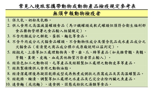 入境旅客攜帶常見動植物或其產品檢疫規定參考表 の 無須申報動物檢疫者 (台灣農業部動植物防疫署から引用)