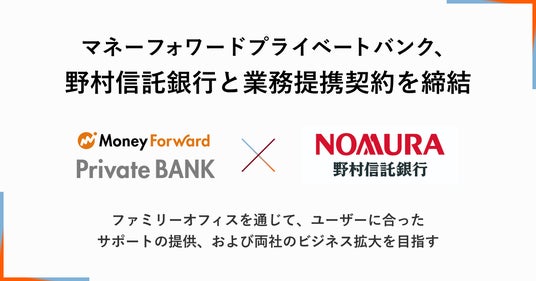 マネーフォワードプライベートバンク株式会社は、野村信託銀行株式会社と業務提携契約を締結しました。本契約締結により、当社ファミリーオフィスのユーザーは、野村信託銀行が提供する、豊富な金融商品・サービスにアクセスいただくことが可能となります。当社は野村信託銀行とともに、超富裕層へのカスタマイズ性の高い資産形成、資産管理をサポートしてまいります。