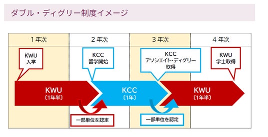2.本来なら6年間(KWU 4年間+KCC 2年間)掛けて学位を2つ取得するところ、相互に単位認定を行うことにより、4 年間※で両大学の学位取得が可能となる。