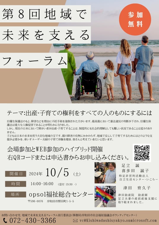 子どもは日本の未来を担う大切な地域の宝です。親の障害の有無にかかわらず、地域で安心して子育てするためにはどのような支援が必要かを、車いすユーザー夫婦の子育て体験を聴き、皆さんと考えていきたいと思います。