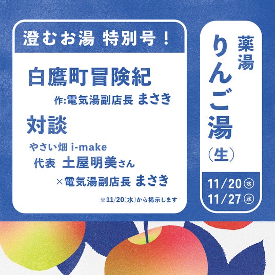 浴室内では、電気湯副店長・正木健が制作した「白鷹町冒険紀」と、やさい畑 i-makeの土屋明美さんとの特別対談を掲示。