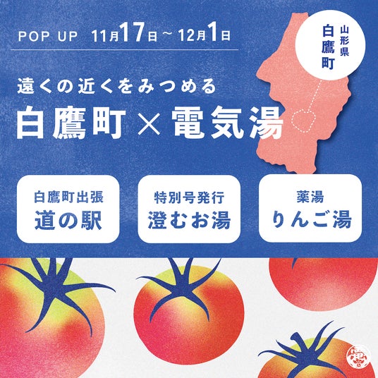 四季折々の豊かな自然に包まれた山形県白鷹町と、東京都墨田区京島にある銭湯「電気湯」が、このたび初の地域連携企画「遠くの近くをみつめる」を開催します。期間は11月17日(日)から12月1日(日)まで。電気湯では、白鷹町の日常や特産品を、都心にいながら体感できる展示や特別販売を行います。